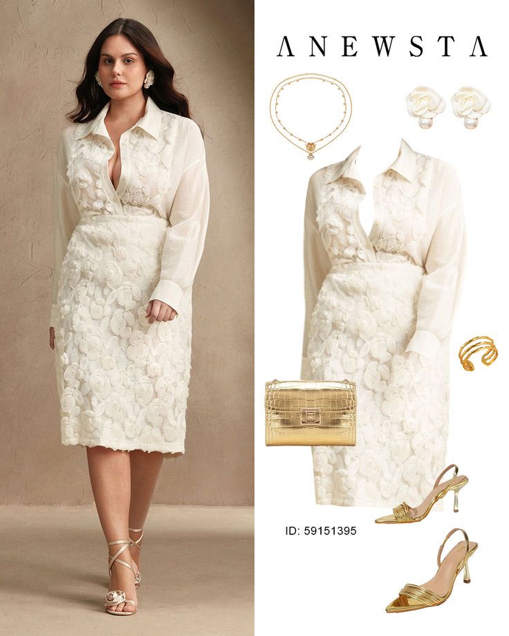 Anewsta New Textured Embossed Jacquard Elegant Commuter French Style Shirt & Skirt Set, Business Casual, Chic, Modern, All White